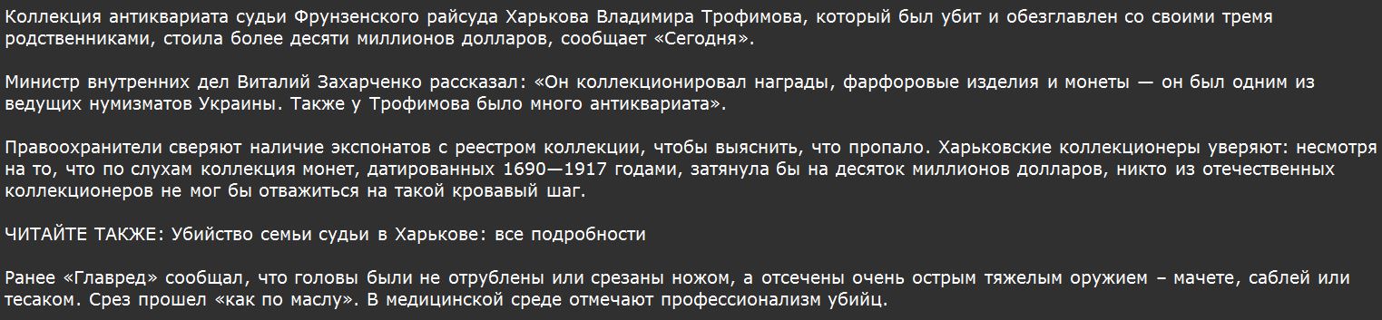 Кста, про судью уже пишут, что коллекция монет у него была самая крутая в СНГ(или одна из самых - по разным оценкам). Судья был потомственный, отец его тоже судья. Родители его живы, но им до сих пор не сообщили(90 и 86 лет).