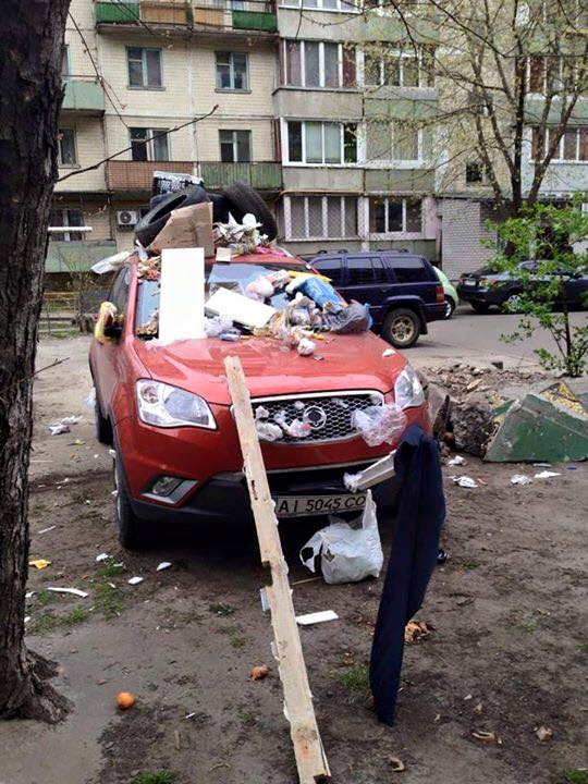 ИМХО это мусоровозчики постарались, видимо машина перекрыла им доступ к бакам с мусором.