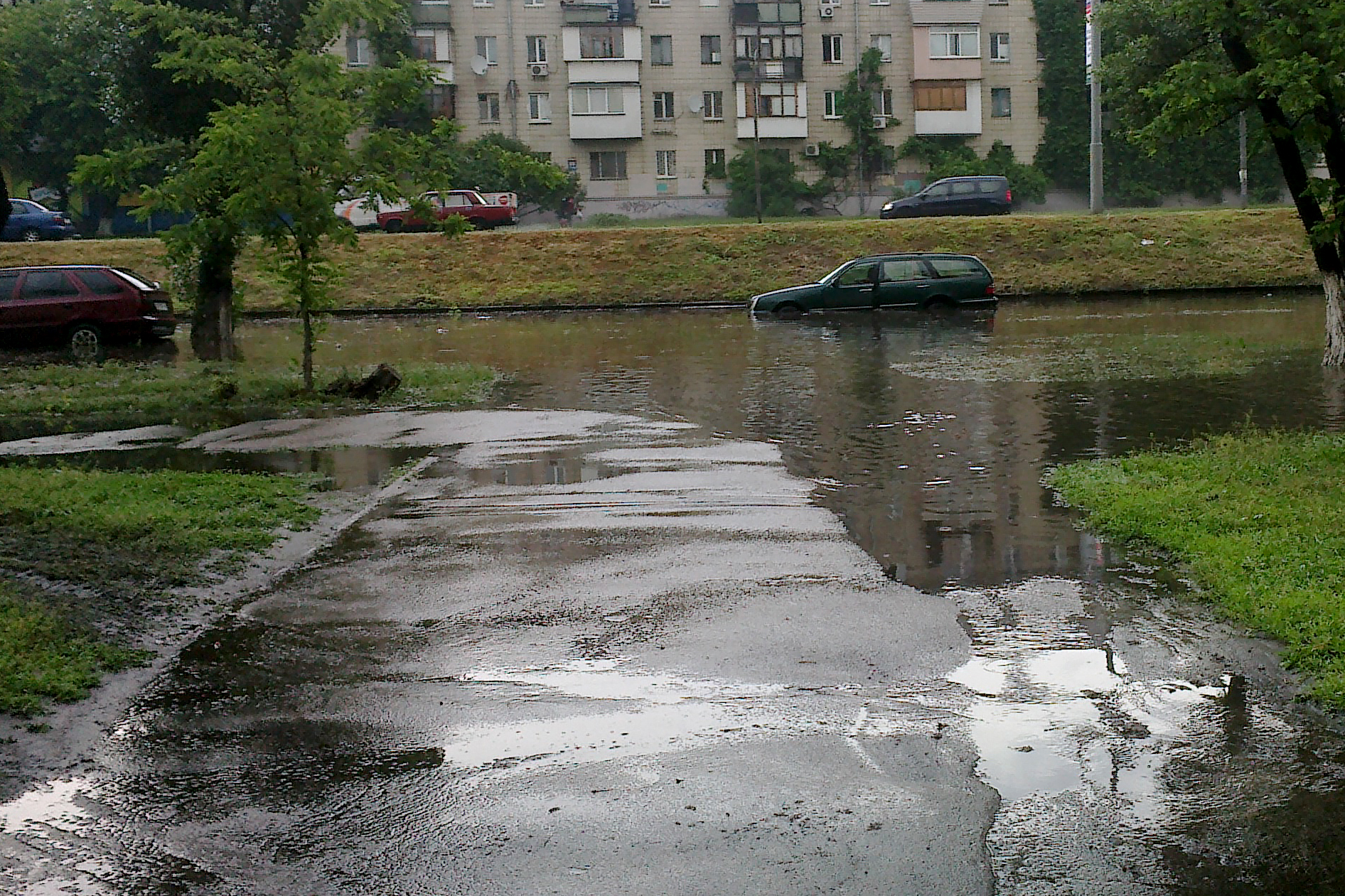 У Києві пройшла дуже сильна злива. За словами очевидців, за 10-15 хвилин дощ повністю залив дороги на Борщагівці. Зокрема, затоплена ділянка дороги по проспекті Леся Курбаса між зупинками "Сім'ї Сосніних" і "Гната Юри".