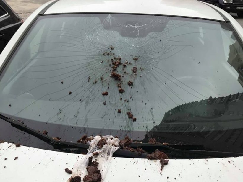 «Ось таке прилетіло сьогодні на переднє скло моєї машини. Це не те, що ви подумали, а мокрий, найімовірніше, празький торт, скинутий, судячи за силою удару, з дуже високого поверху будинку на Срібнокільській 22. Яким потрібно бути козлом і виродком, щоб зробити таке!!! А якби на голову? Так, не дай бог, дитині!!! Так, до Європи нам як до неба», – написав власник постраждалого автомобіля.