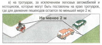 Стоянка запрещена на тротуарах, кроме мест обозначенных соответствующими табличками, но и в этих случаях разрешено только легковым авто и мотоциклам и при условии сохранения 2-х метров для пешеходов.