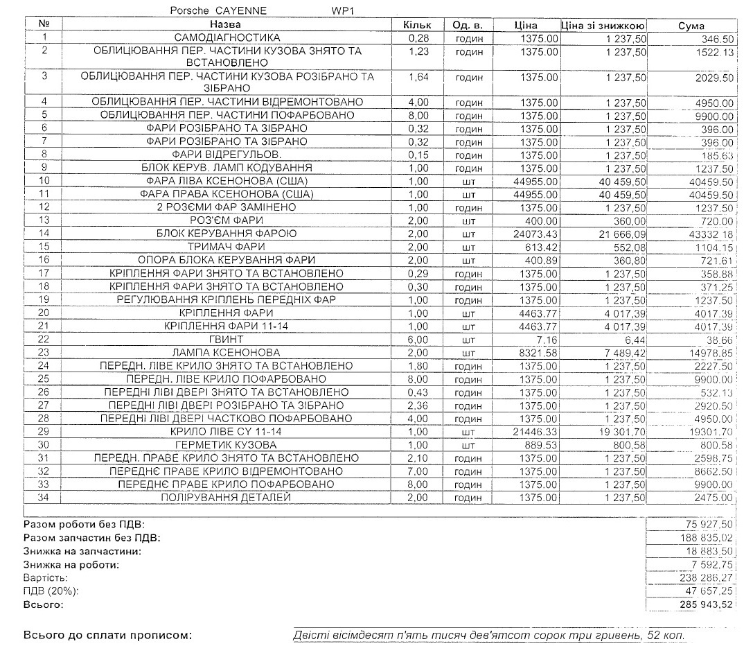 Счет фирменной СТО - 286 тыс.грн. Это со скидкой.