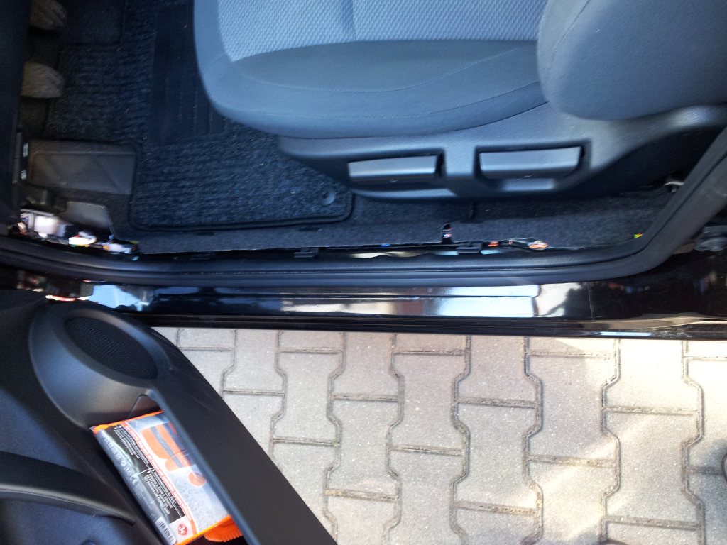 Я вел его параллельно оригинальному пучку кабелей, примерно через каждые 5-10 см приматывая его черным скотчем к пучку, но в сам пучок не вклинивался. Для этого пришлось снять обе части обшивки крышки багажника (нижняя и верхняя части), вытащить все с багажника до самого днища. Оттопырить сверху с левой стороны белую обшивку между D- и C-столбами. Снять левый порожек под вторым рядом сидений. Снять порожек около водителя. Снять нижнюю часть из черного пластика на левом B-столбе (та что между водительским порожком и порогом второго ряда). Да, еще пришлось открутить верхние болты держащие левые ремни безопасности второго и третьего ряда.