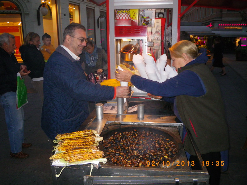 Мы попали туда к вечеру после посещения озер. Прошлись по центру. Получили общее впечатление и отправились восвояси. На главной площади выяснилось, что Леня всю жизнь мечтал попробовать жареные каштаны. Его мечта сбылась!