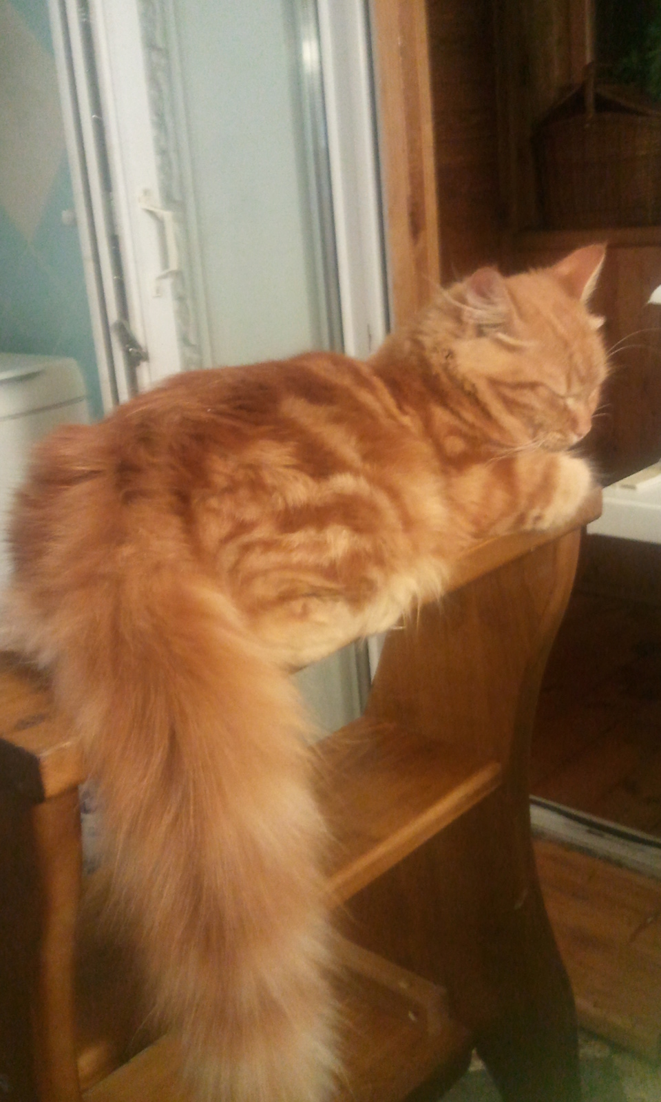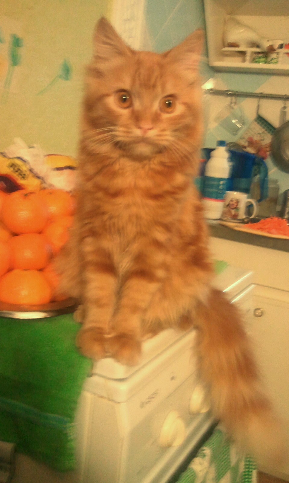 Вот на фото мальчику было 7 м-цев (у крошки папа май-кун, мама - перска), но от персов там ничего - сейчас ему год и на 2-х дачных кооперативах фсе котята будут рыжие - соседи уже щас грозяцца рыжиков нести нам :smile: . а бывших местных крутых котов-бойцов уже м-ца 2 как нету поле видимости ...