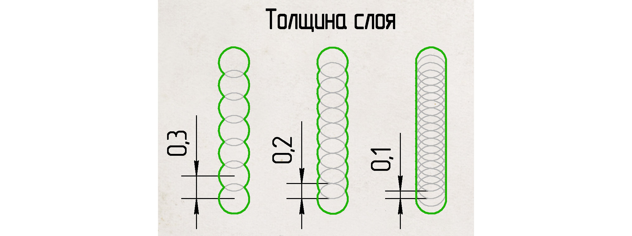 Ширину этой полоски сделать меньше 0.4мм нельзя (только замена сопла что весьма проблематично), высоту сделать 0.1мм можно в один клик (если принтер поддерживает, обычно поддерживает). С разрешением по высоте разобрались, теперь вернемся к стенкам. Если сопло 0.4мм, сделать стенку 0.5мм довольно сложно :) Поэтому стенки делают кратными диаметру сопла 0.4, 0.8, 1.2, дальше толщина может быть любым за счет перекрытия (частичного наложения).