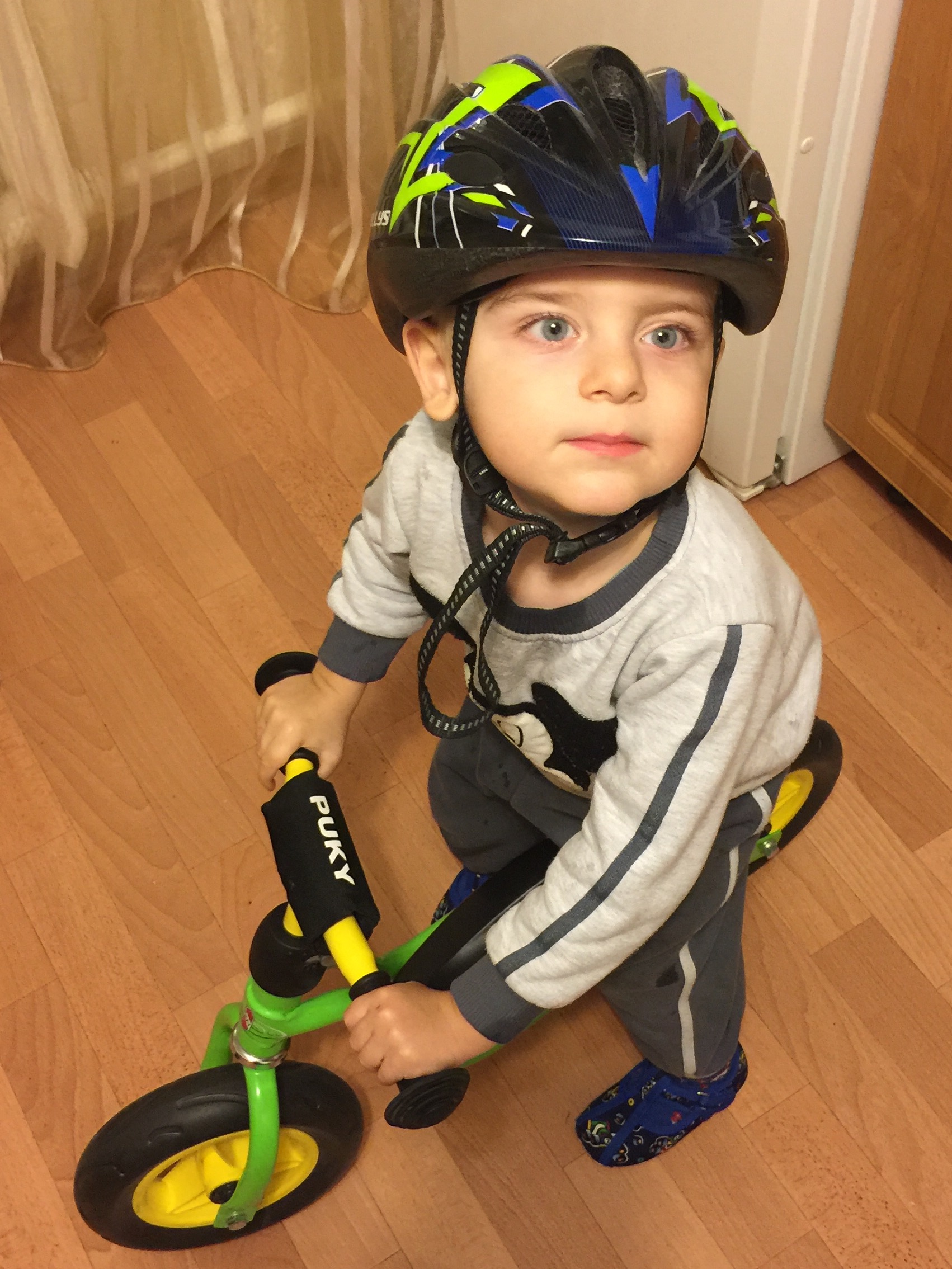 И еще момент: одевать очень аккуратно. Я малому в один из разов случайно чуть не прищемил кожу на подбородке, так он полгода отказывался носить шлем, пока не забыл. А сейчас даже дома носит порой.