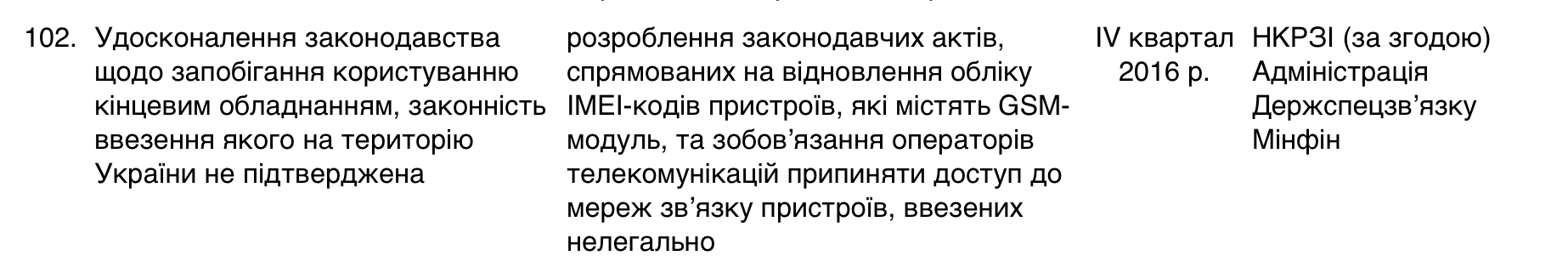 План заходів щодо дерегуляції господарської діяльності», в него включён перечень задач, которые должны упростить ведение в стране бизнеса. Тем не менее, под номером 102 в этот план затесался пункт, который предполагает усовершенствовать законодательство, чтобы препятствовать использованию оборудования, законность ввоза которого на территорию Украины не подтверждена.