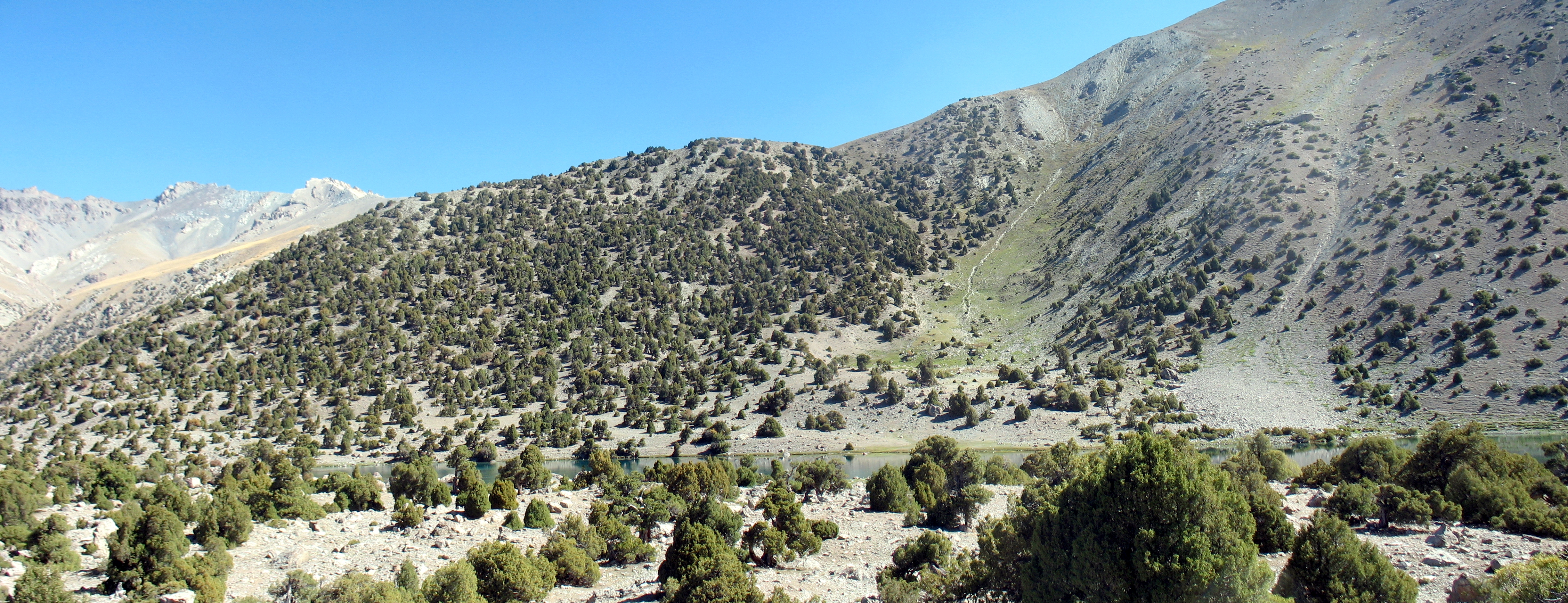 Тропа веде на останній зліт, з-за якого вже виглядають снігові гіганти центральної частини Фанських гір.