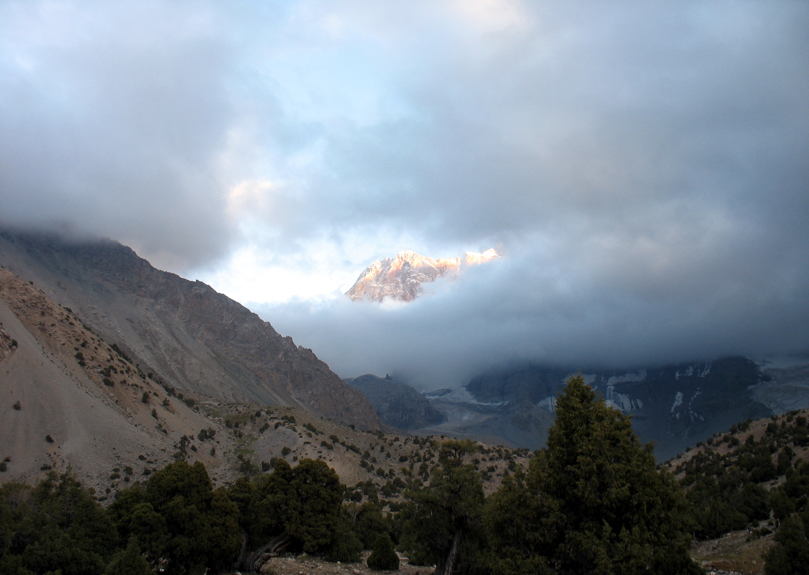 До Мутних озер.Наступного дня було заплановано радіальний вихід без рюкзаків до високогірного цирку, в якому розмістились так звані Мутні озера, навкруги яких знаходяться найвищі п`ятитисячники Фанських гір (пік Чимтарга, пік Енергія, пік Замок…).