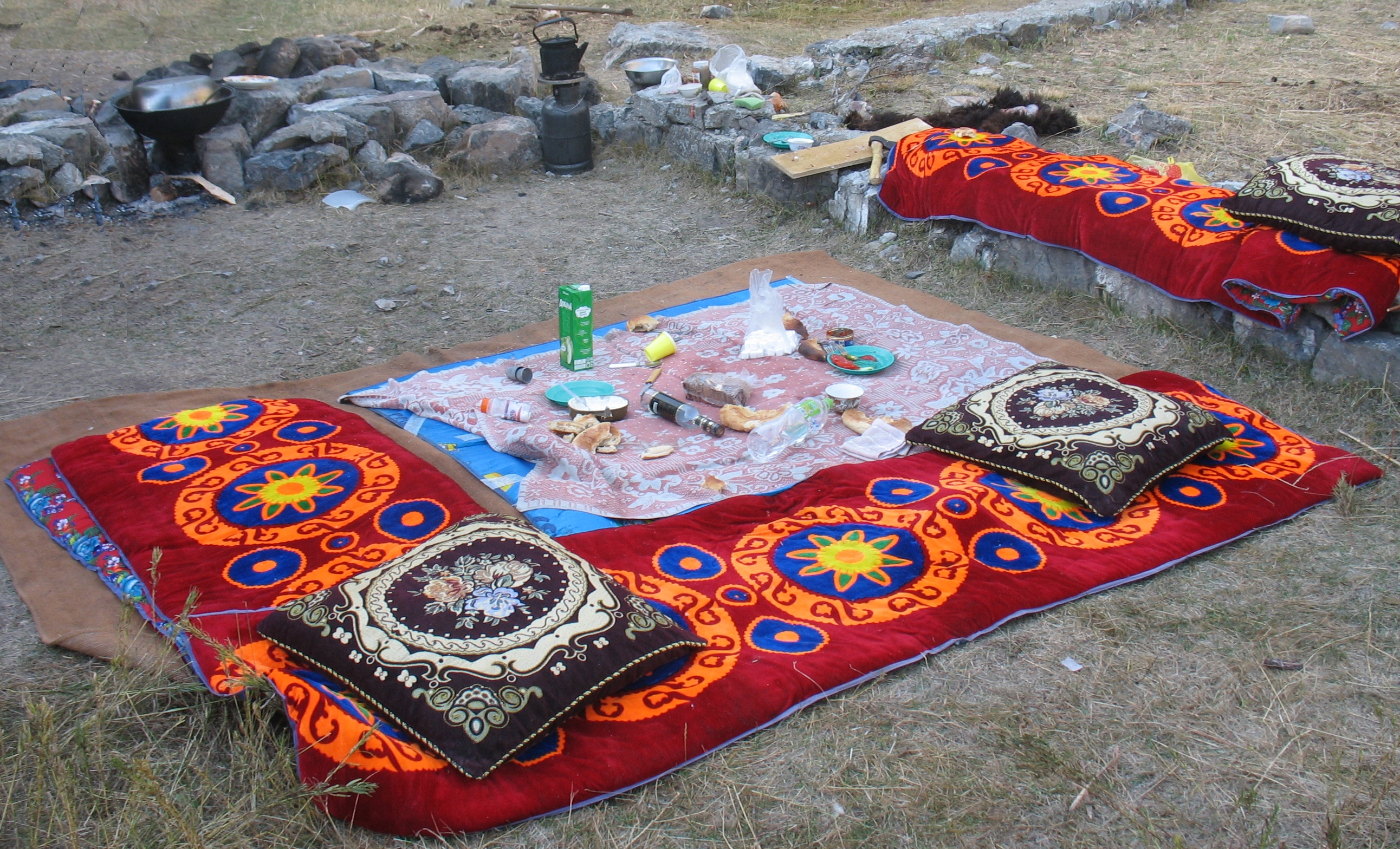 Дорога дає не лише страхи, а ще й позитивні враження: перший наш обід за дастарханом з піджатими ногами. Лагман, кебаби, самбуса, шурпа, просто тушкована баранина з картоплею і овочами, манти, обов`язкові фрукти або кавун з динею – цей набір до кінця мандрівки ми вже вивчили напам`ять. А ще – чай, чай, чай… у більшості зелений і завжди не підроблений.