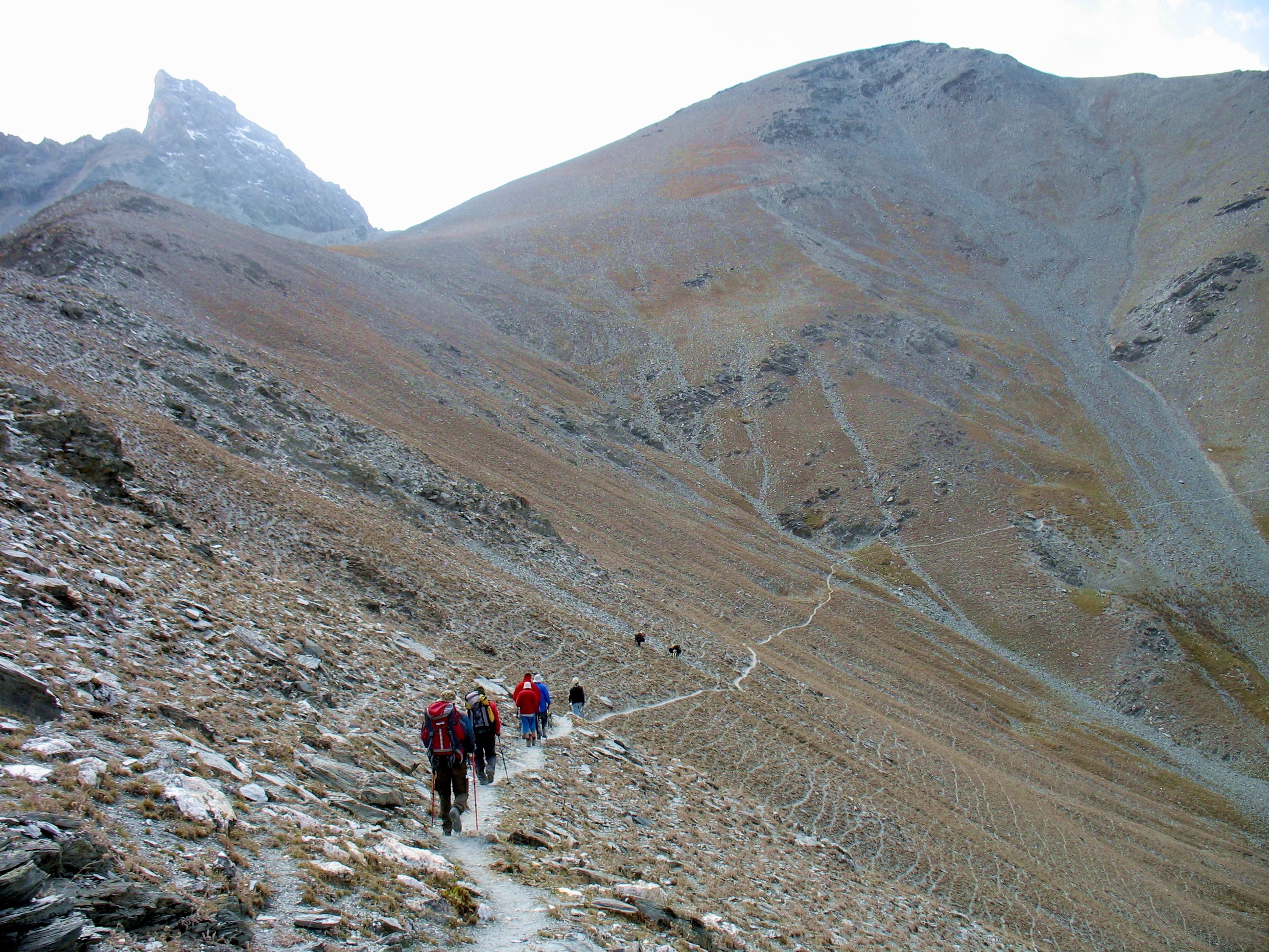 Тропа веде на останній зліт, з-за якого вже виглядають снігові гіганти центральної частини Фанських гір.