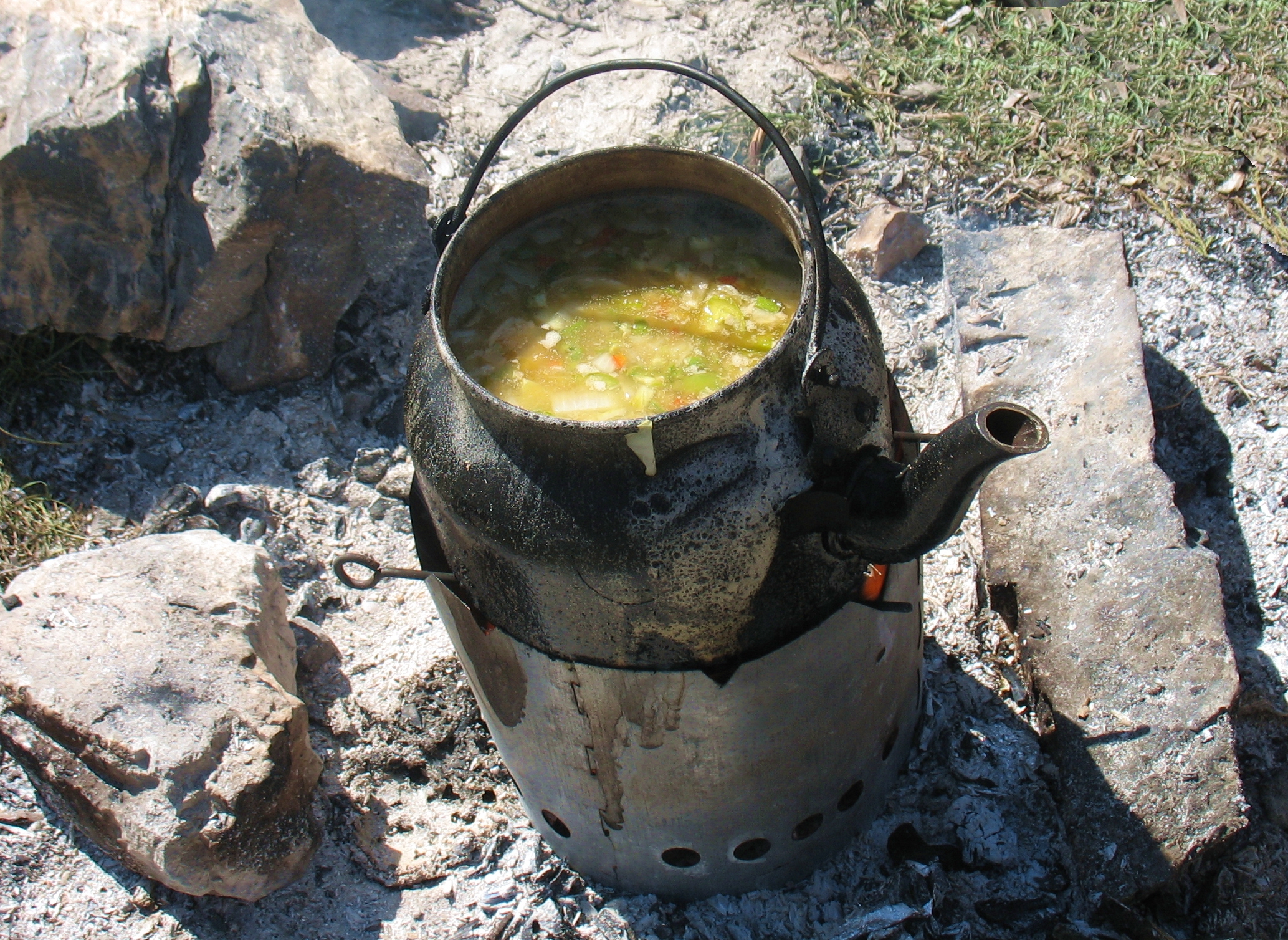 Тут у нашому заслуженому чайнику вариться овочеве рагу. Чотири гіркі перчини, які я туди посік, створили в ротових порожнинах незабутній для декого з непристосованих, ефект Змія-Горинича, і заодно добре відчистили чайник зсередини від накипу. А полум'я пожежі швидко загасили великою кількістю чаю.