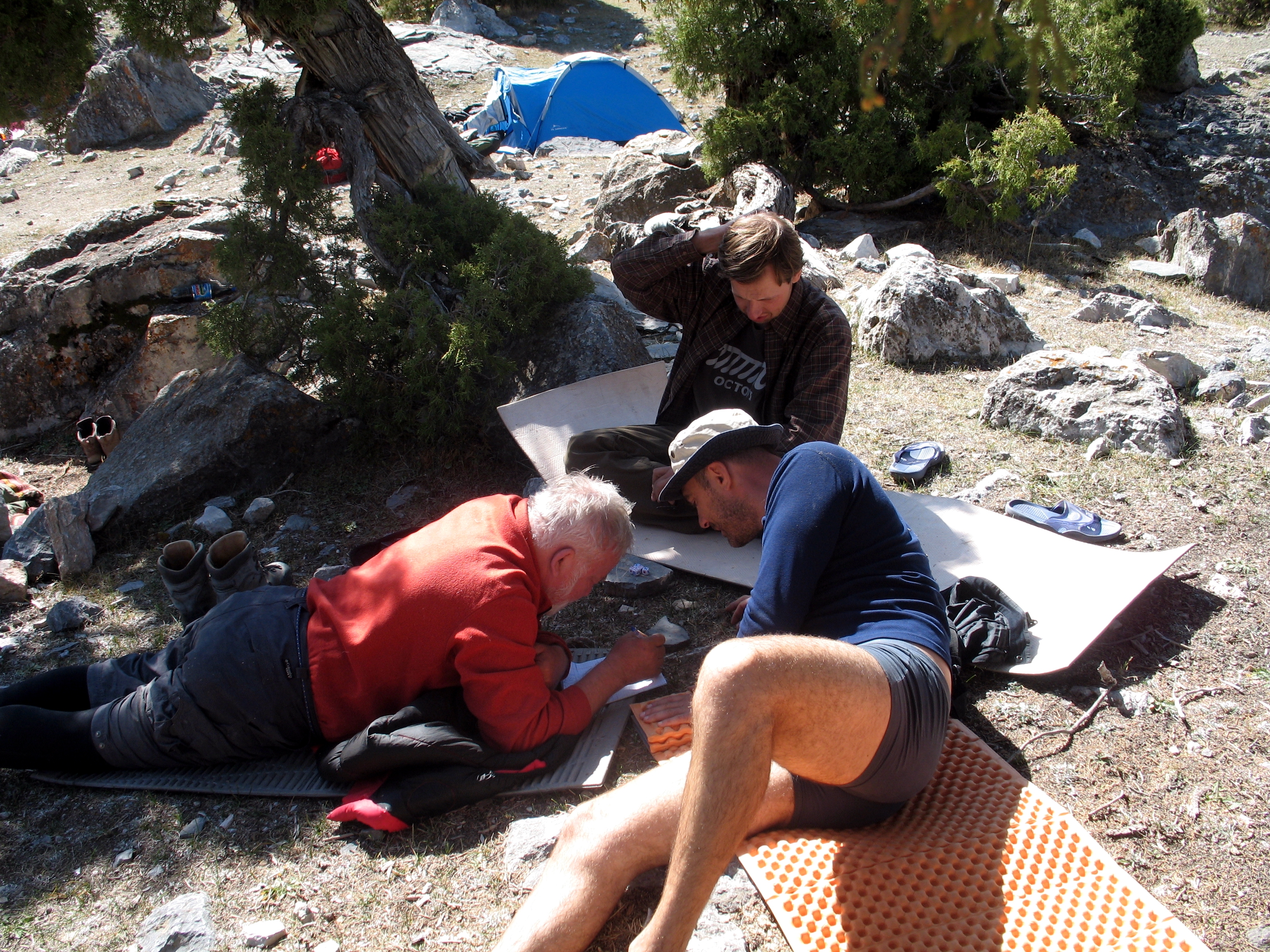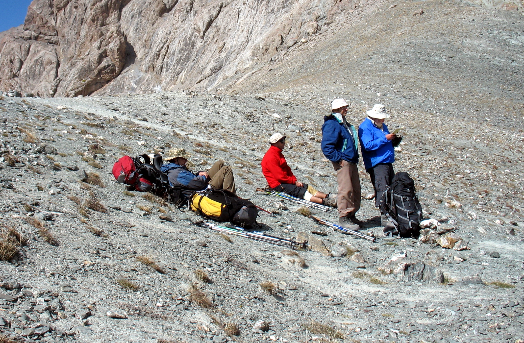Це перекур десь на підйомі на одну зі ступеней завалу, далеко внизу видніються Алаудинські озера.