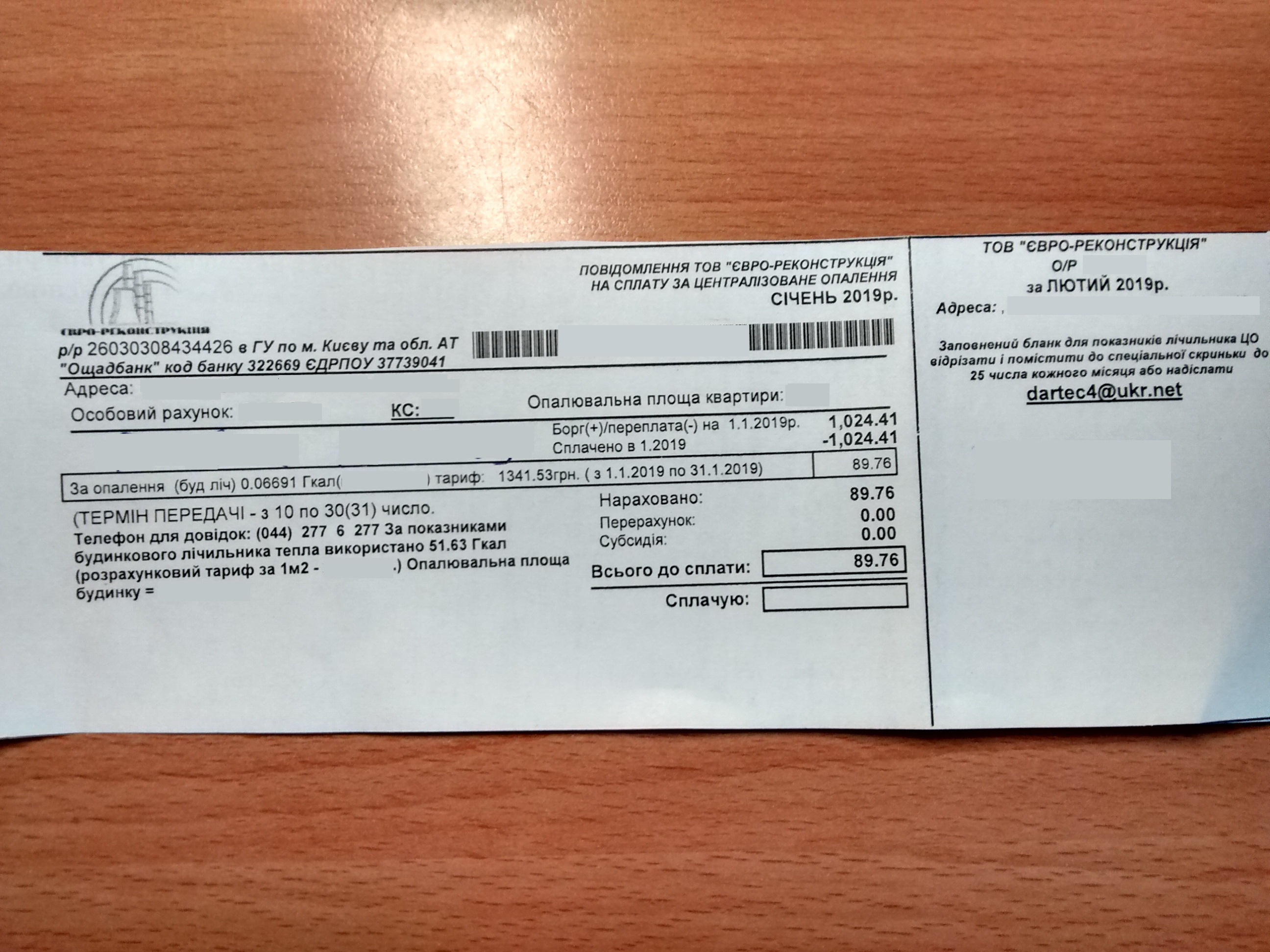 Якийсь дивний рахунок за опалення надійшов від ГІОЦ за січень 2019