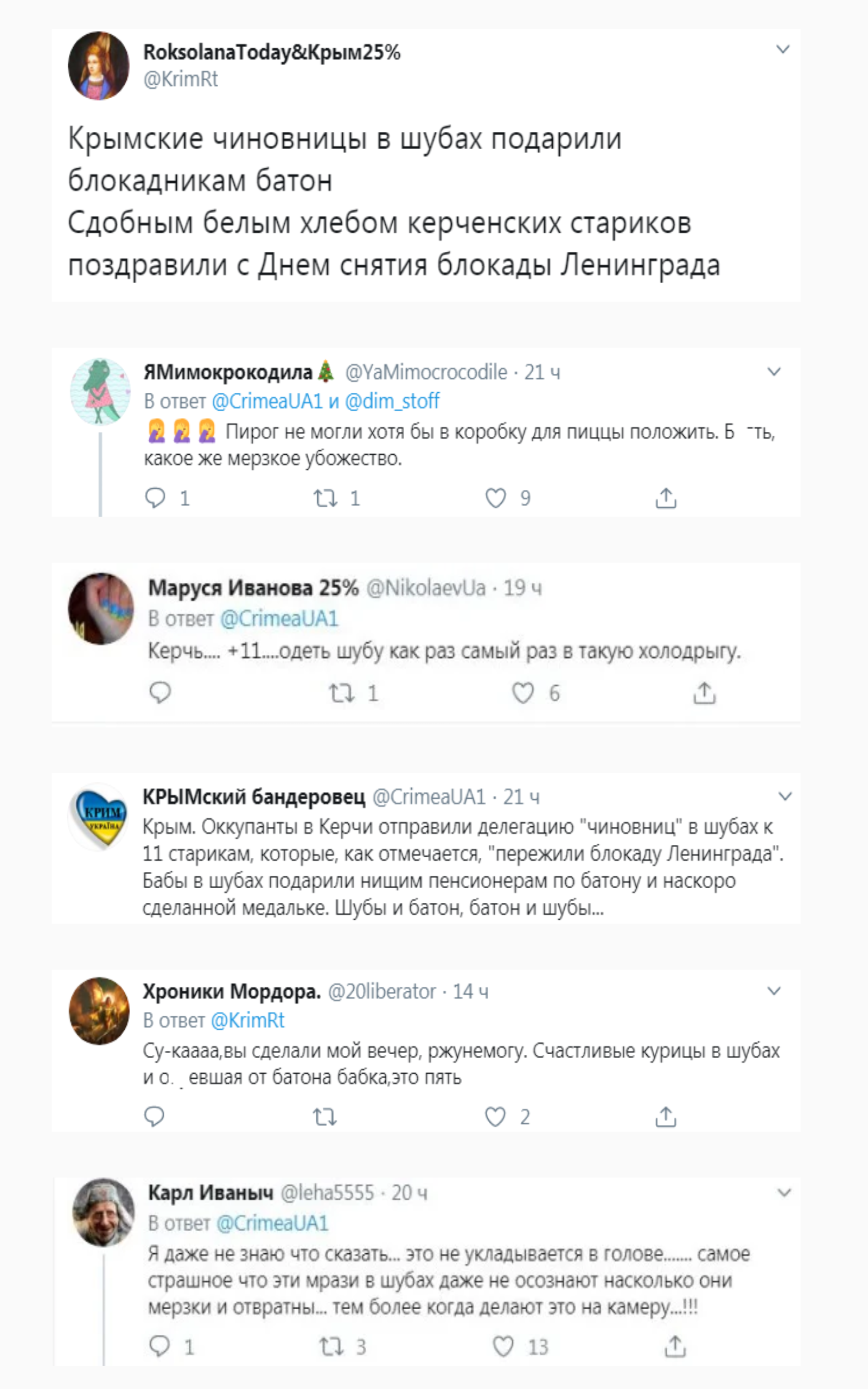 В оккупированной Керчи к ветеранам, пережившим блокаду Ленинграда, приходили «чиновницы» с подарками – медалью и батоном хлеба. Об этом на своей странице в Facebook сообщила «глава» оккупационного горсовета города Майя Хужина, которая сама участвовала в данном мероприятии.