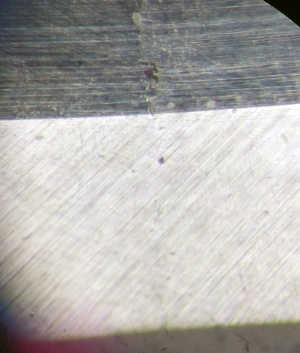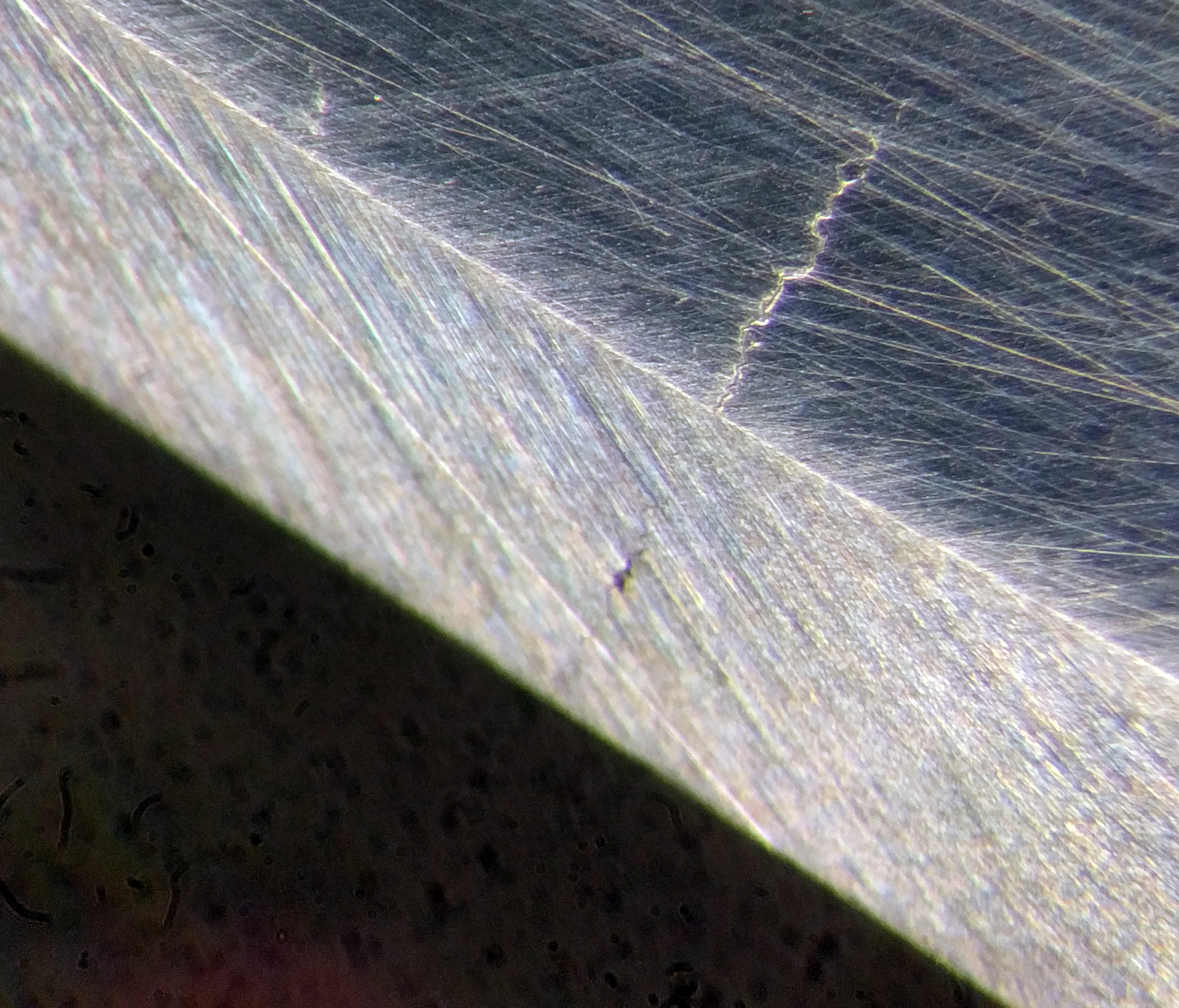 Сначала вроде все нормально было. Как начал переходить на более тонкие камни, начал пробовать рез. Вижу что-то не то. Смотрю в линзу на кромку, вижу микровыкрашивание. Прохожу еще раз, оно все равно проявляется. Короче, поставил микроскоп. И тут...