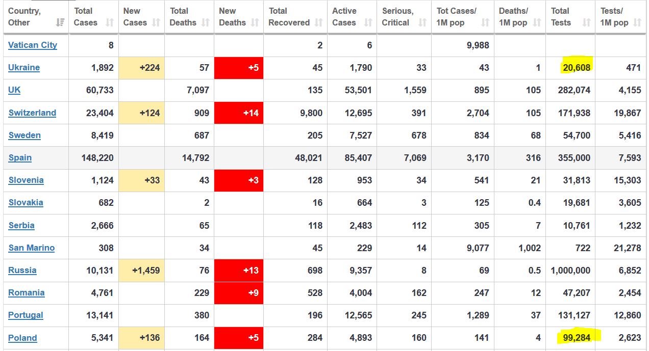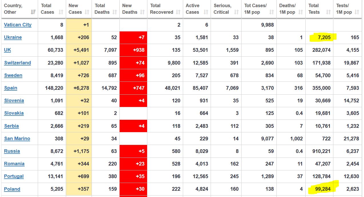 Надеюсь, это не ошибка, и тестов в Украине действительно стали делать больше в разы. Потому как корелляция между нашими странами на лицо. То есть отношение диагностированных плляшет с отношением количества тестов. Уровень летальности практически одинаков пока - 3%.